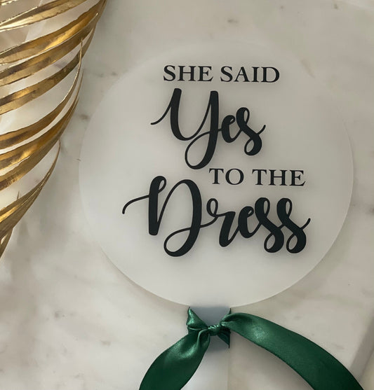 Yes to the dress sign / paddle. Bridal shop sign. Wedding dress sign. Black and white wedding. Monochrome.