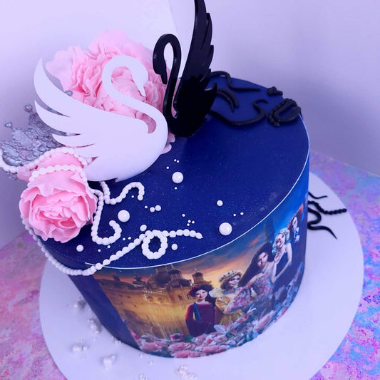 Black and White Acrylic Swans . Approx 3.5 inches wide. Good and Evil theme. Edible icing.