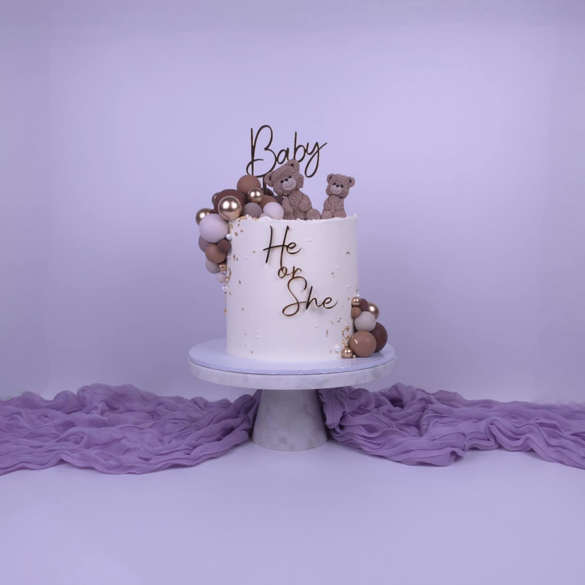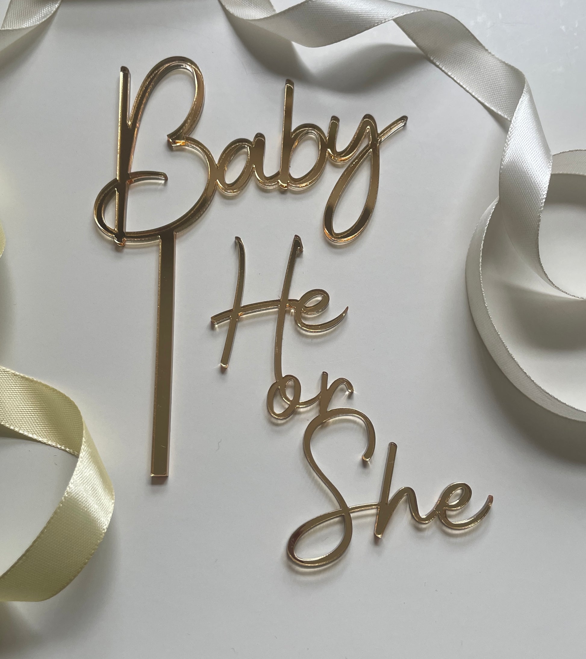 Acrylic Baby topper and He or She charm set is perfect for your gender reveal cake.