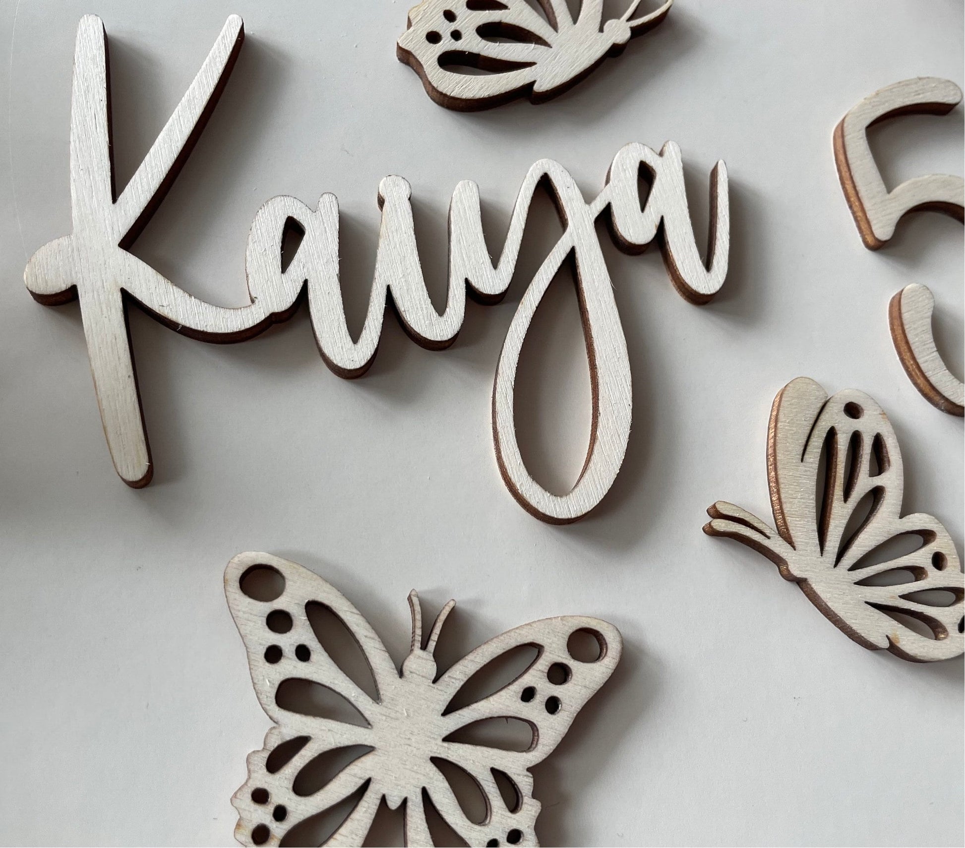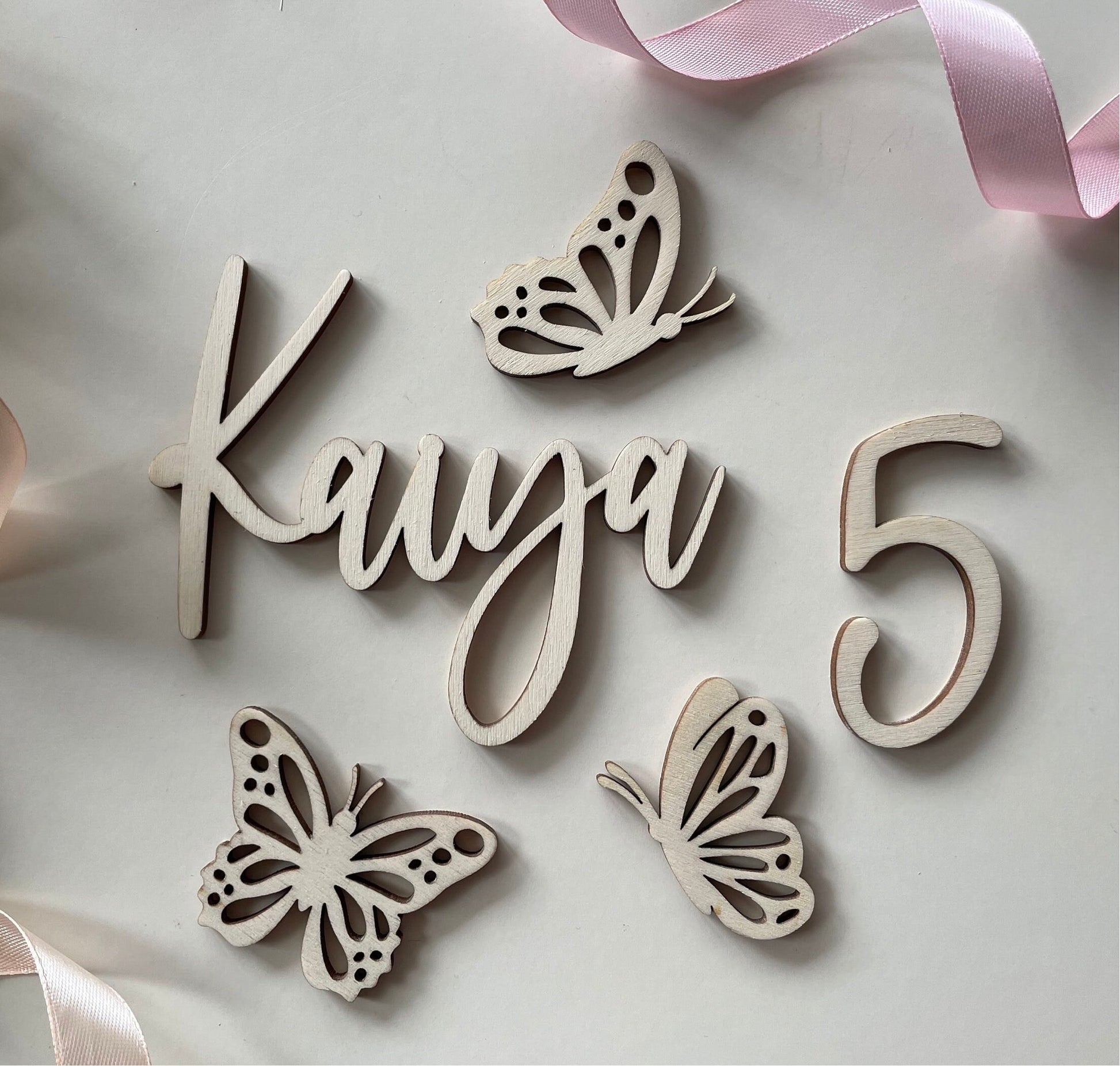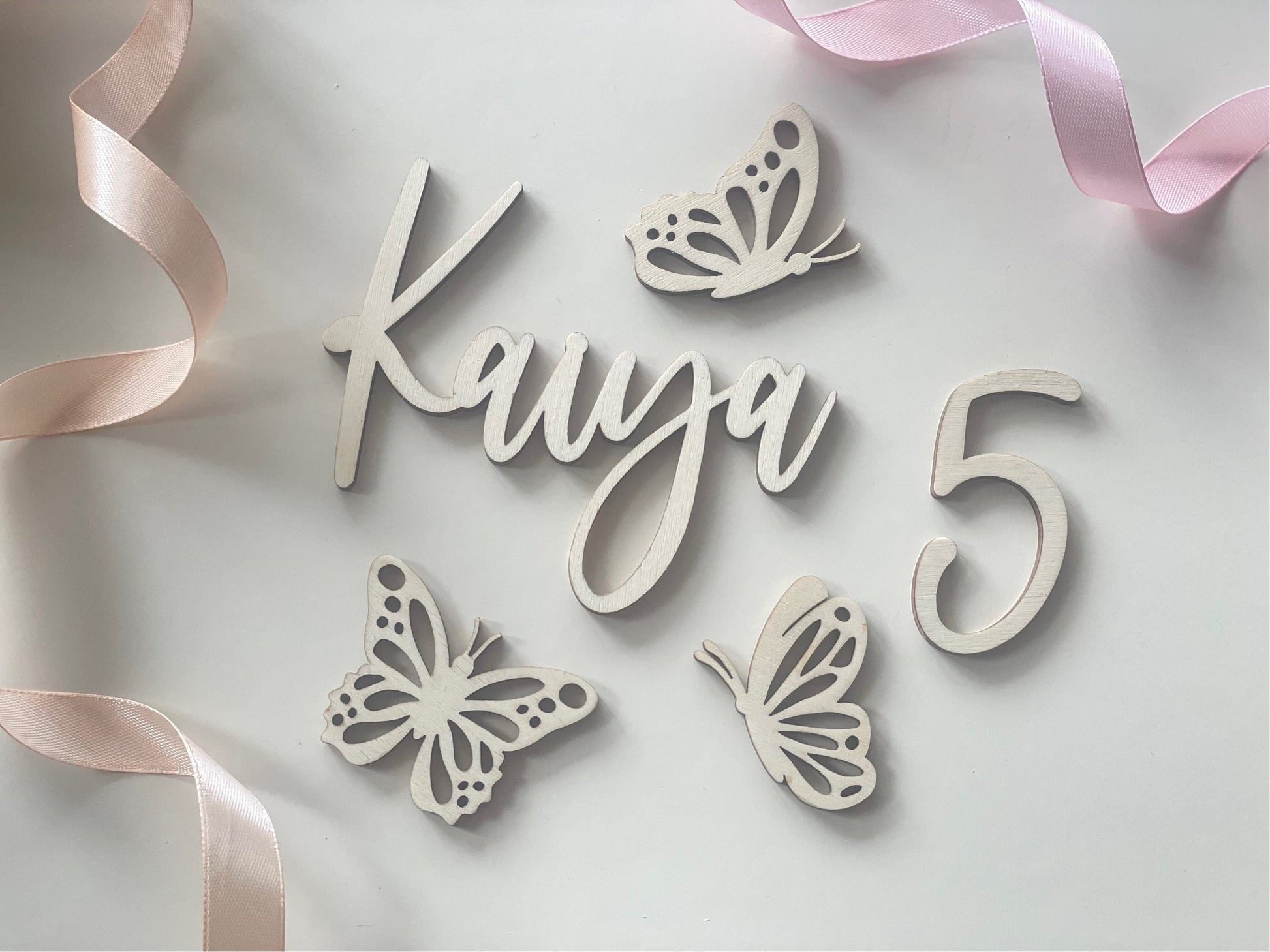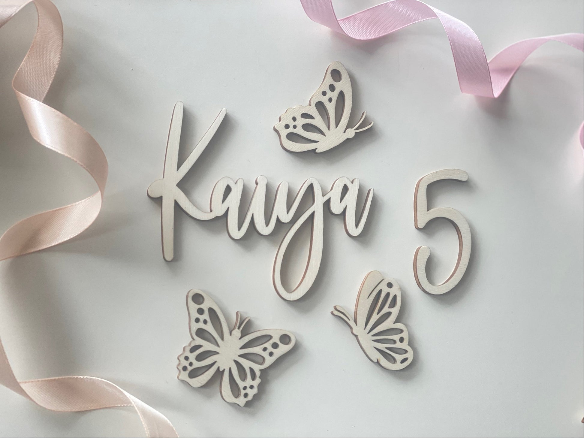 Our wood butterfly theme charm set includes name, age and 3 butterflies.