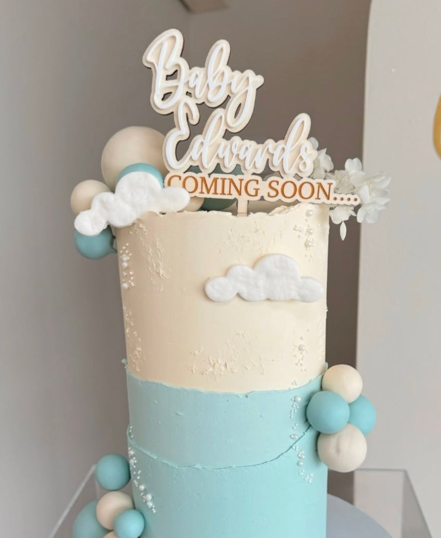 Our Baby Name Coming Soon Topper can be personalised with one name.