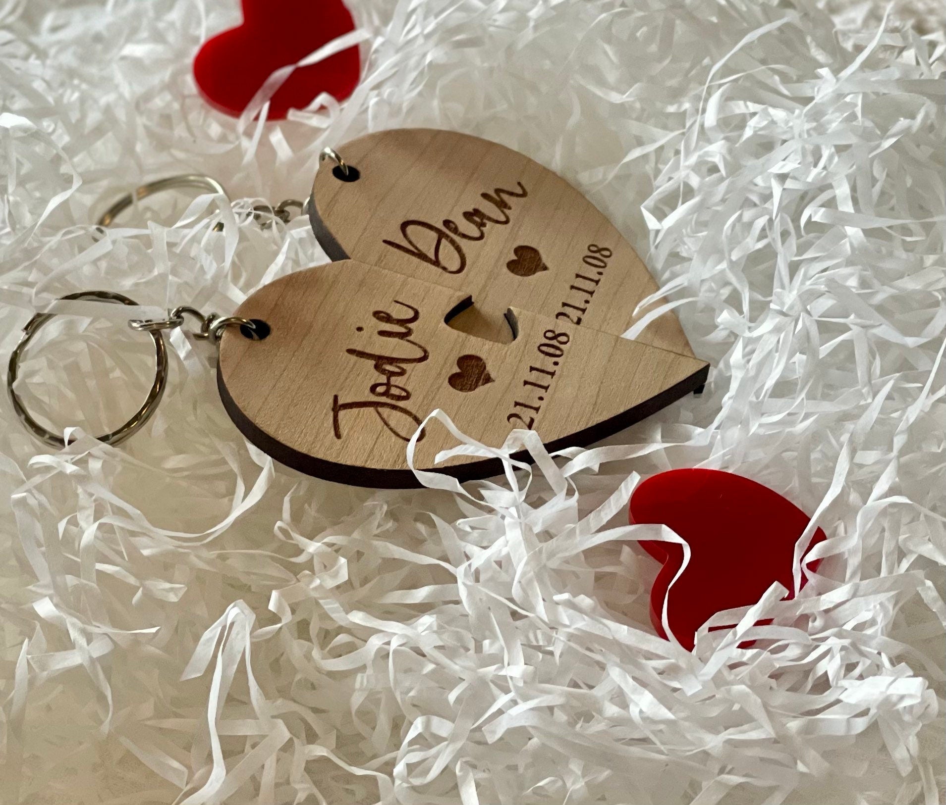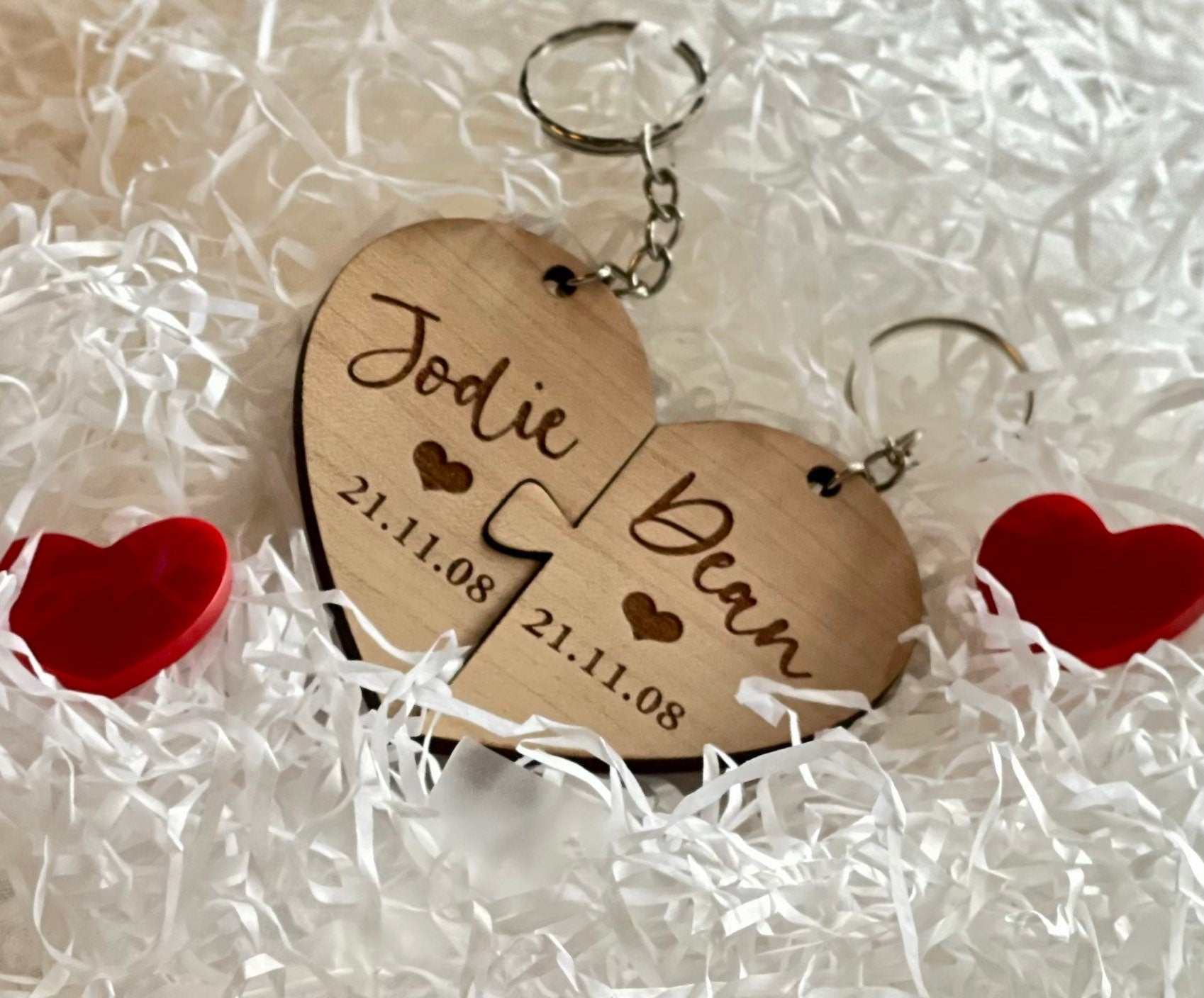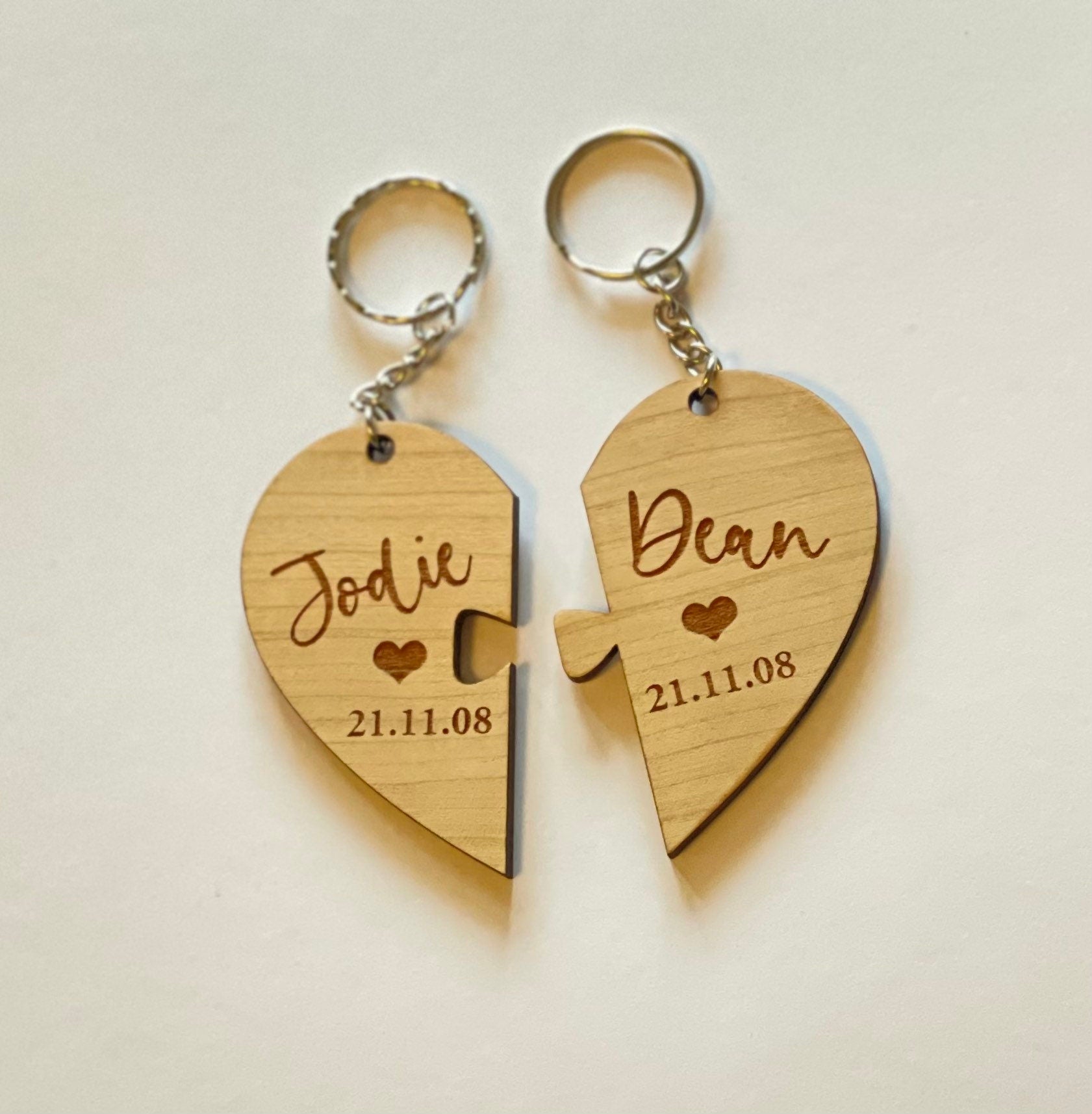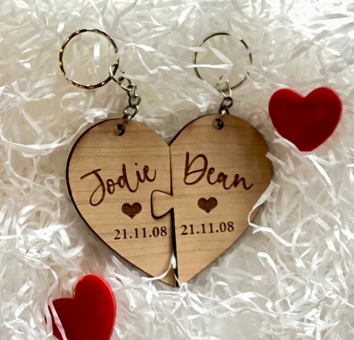 Personalised Couple keyrings. Wooden heart keyrings. Puzzle piece. Couple Gifts. Interlocking Heart Wooden Keyring. name and date .