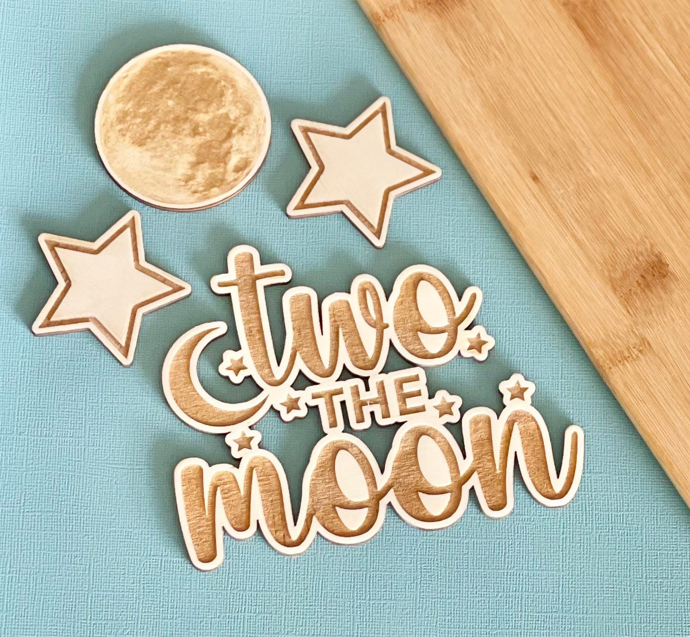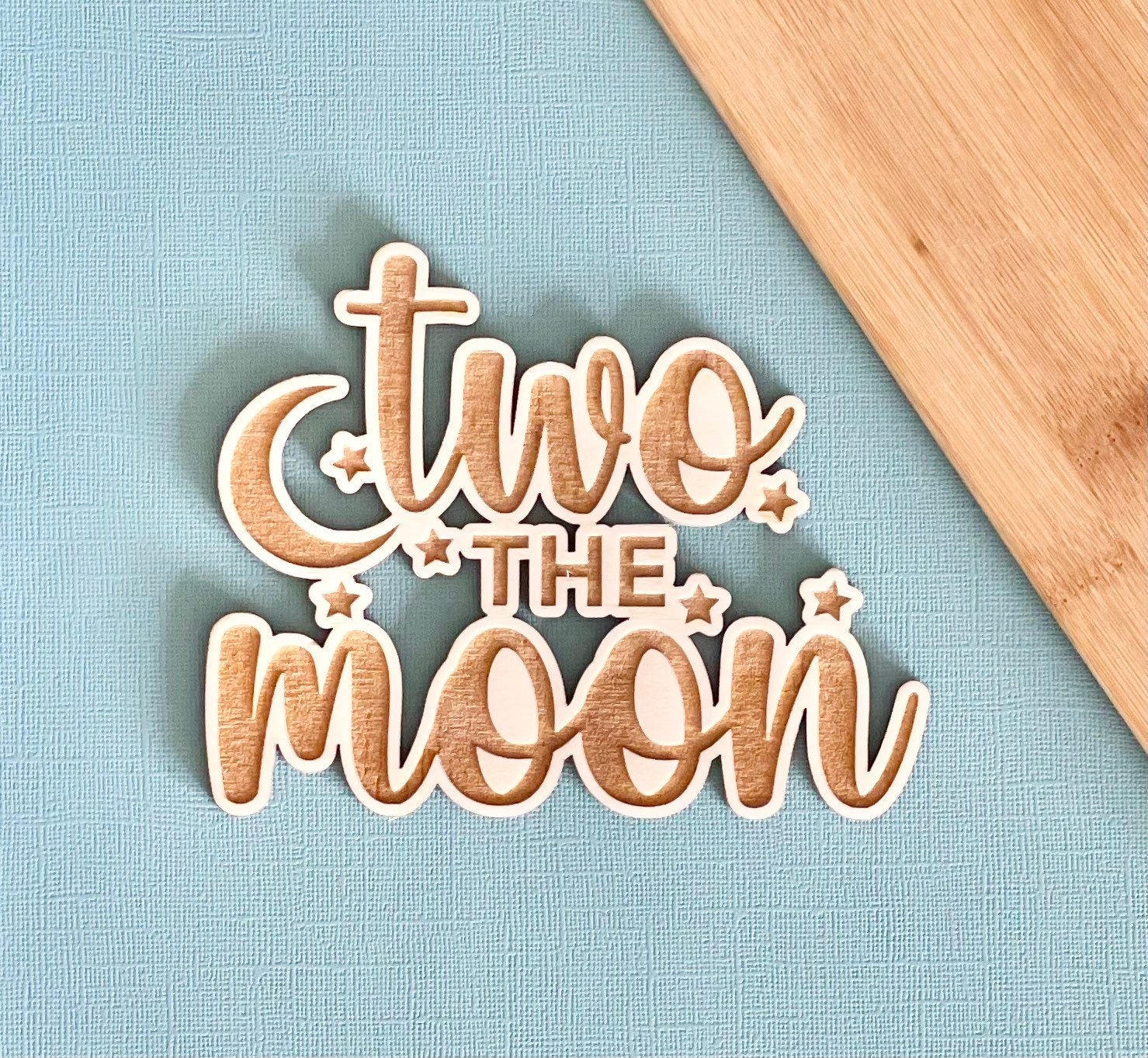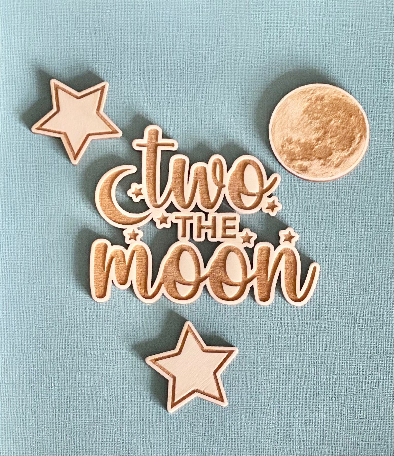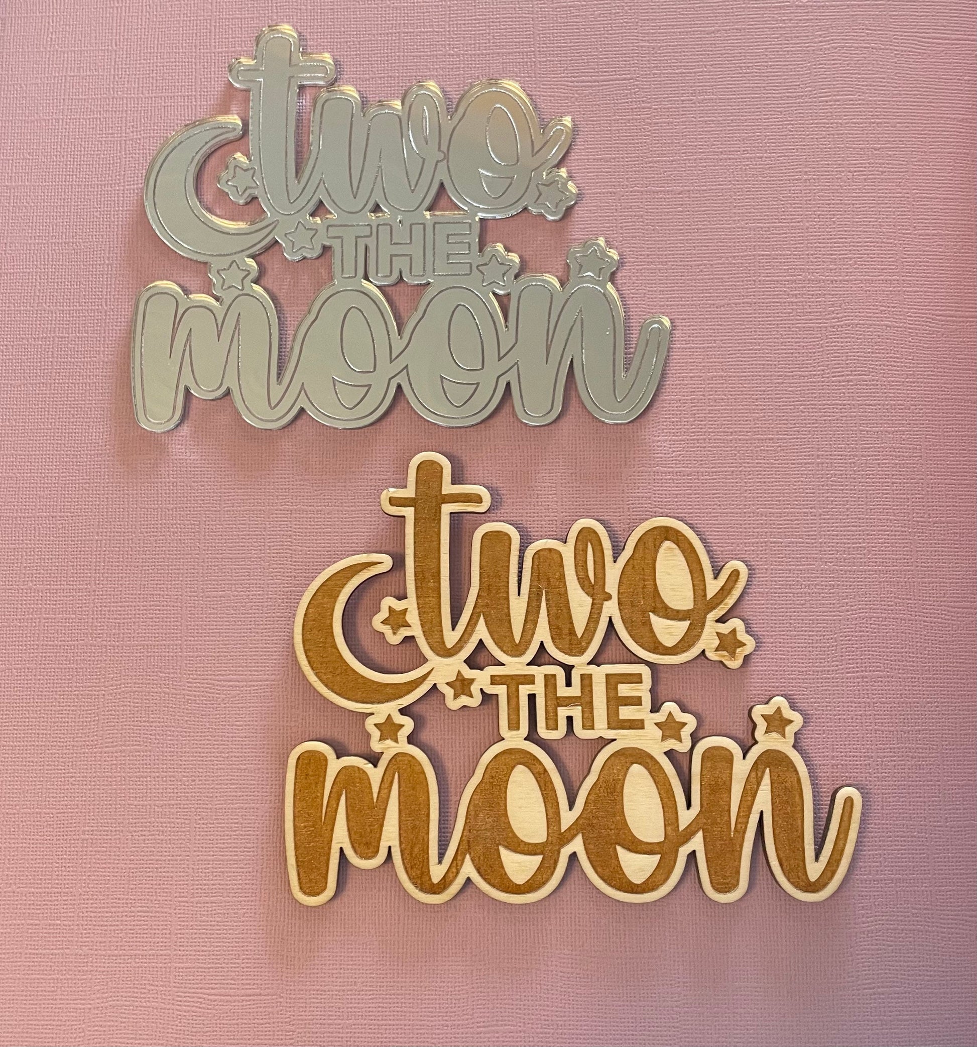Our two the moon wooden topper complete with two stars and a realistic moon.