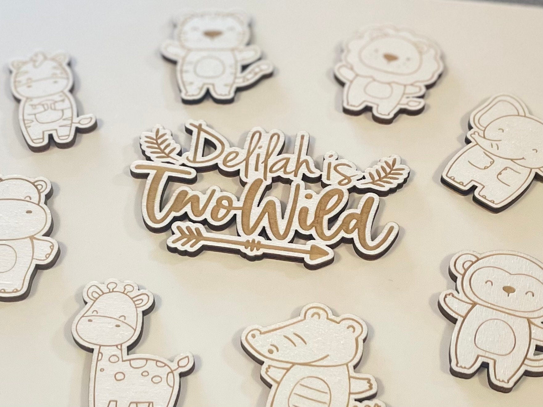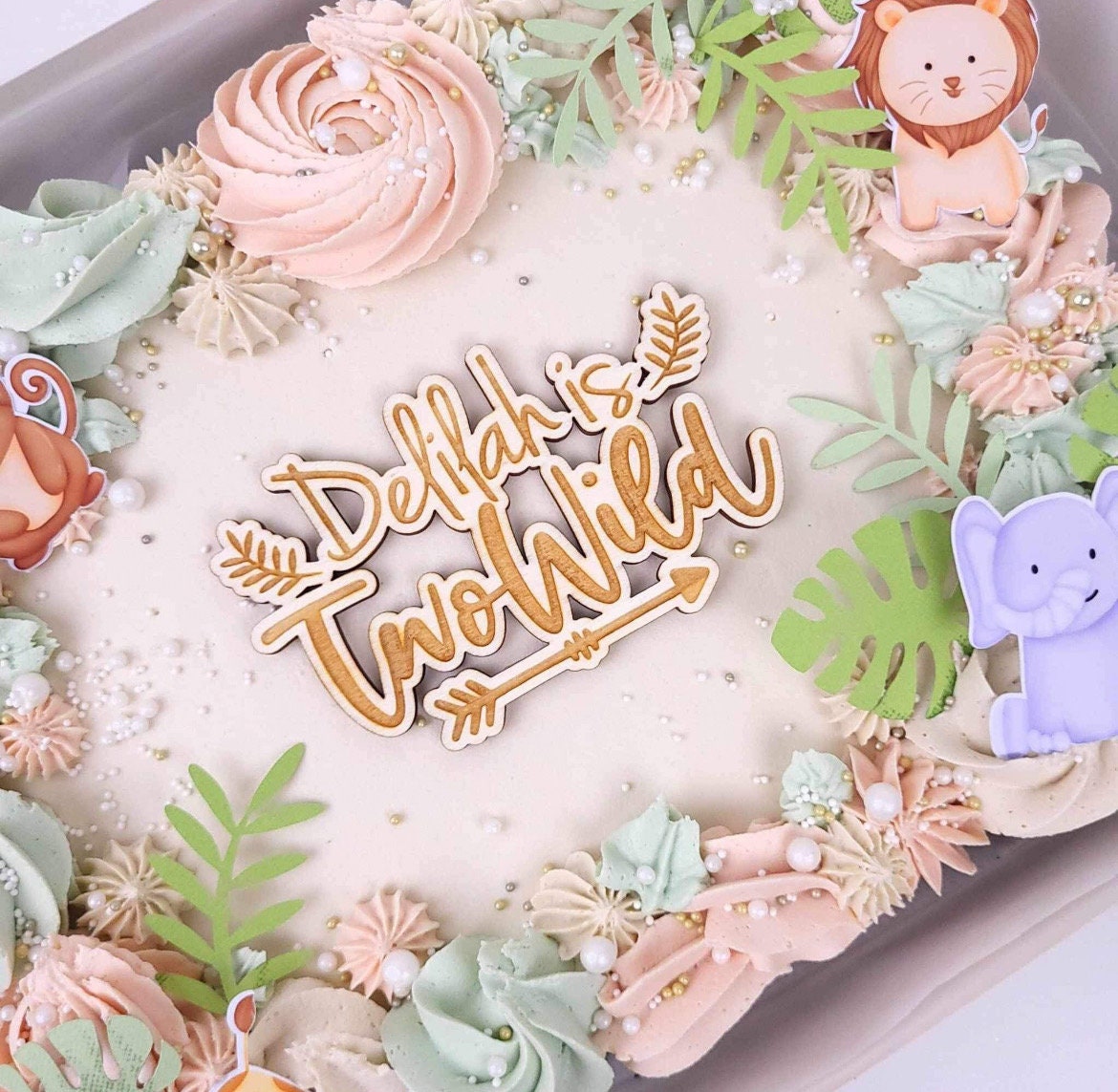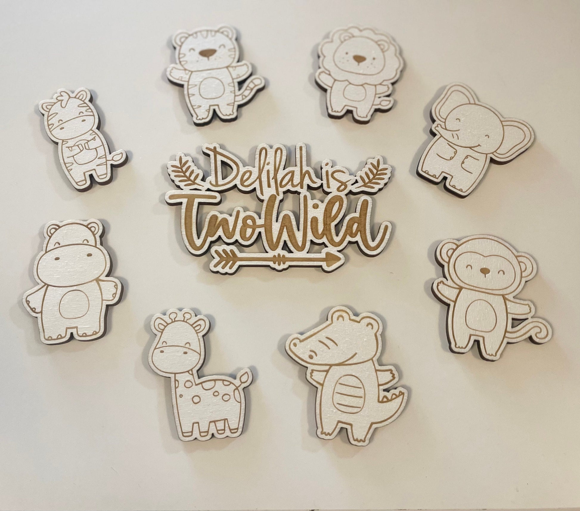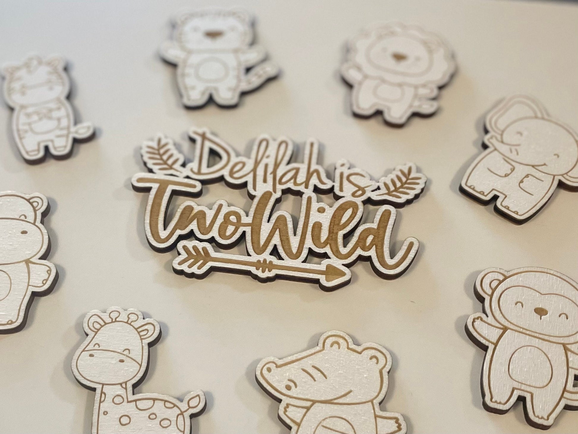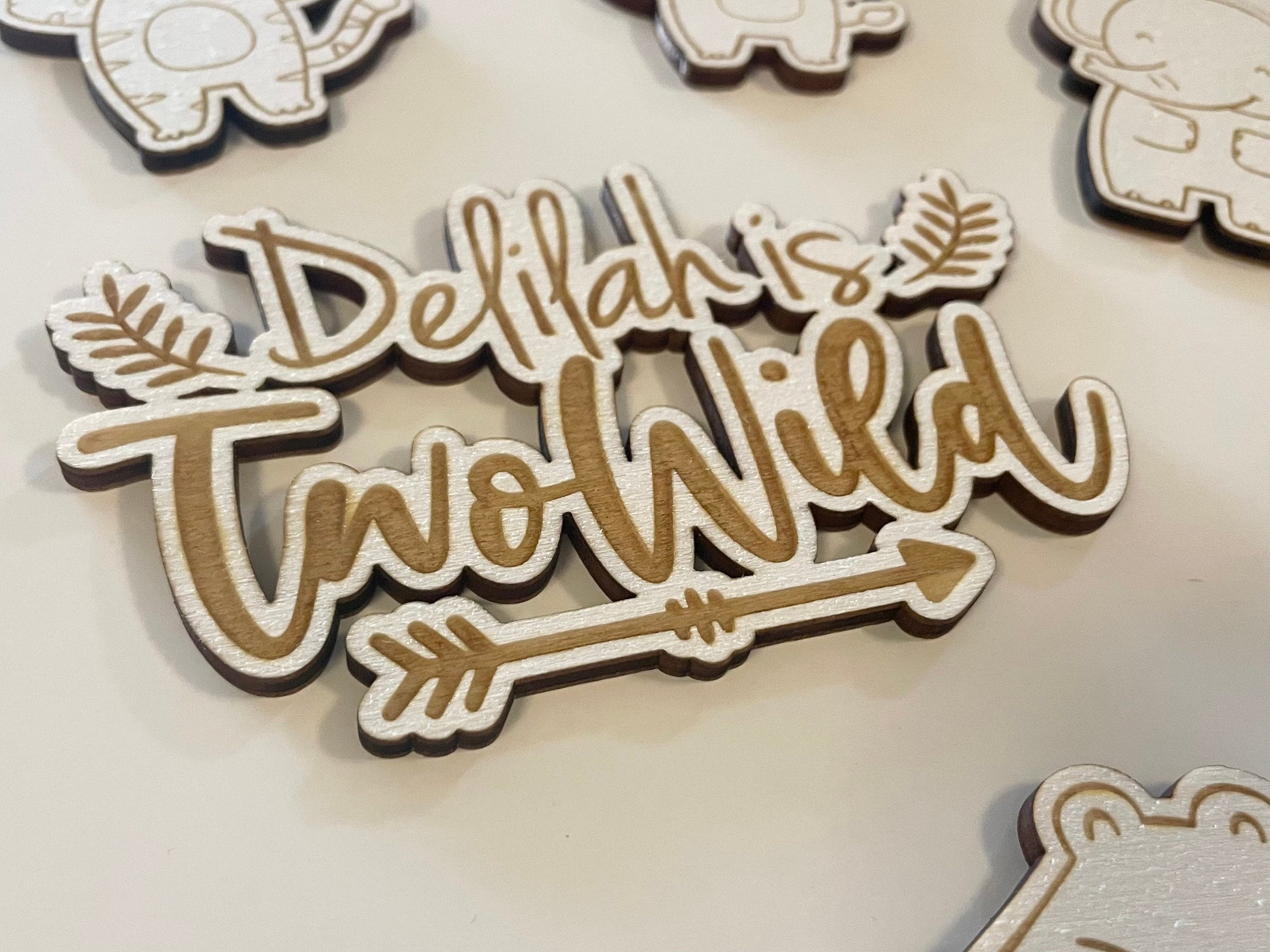 Personalise our two wild cake charm with any name. Matching wooden animal also available.