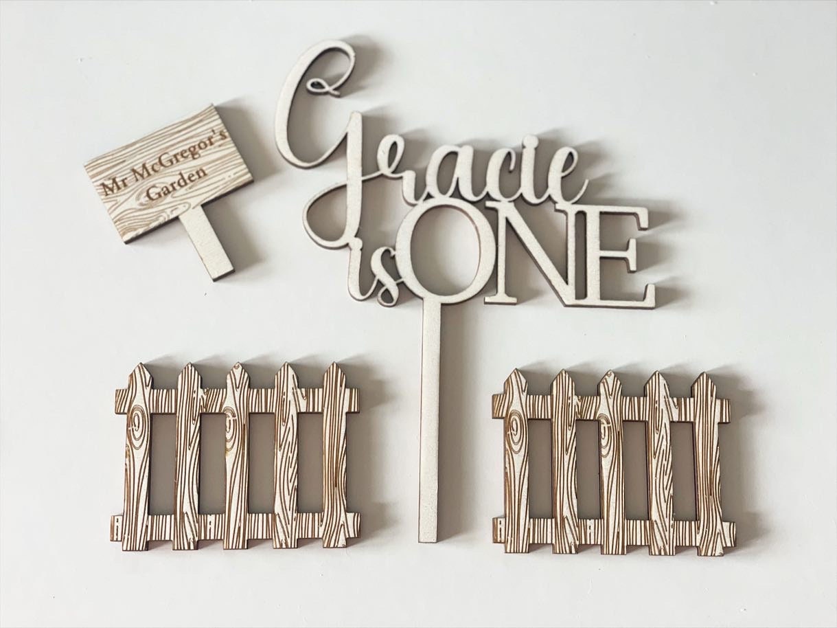 Set includes one topper, two fences, one rabbit, garden sign.