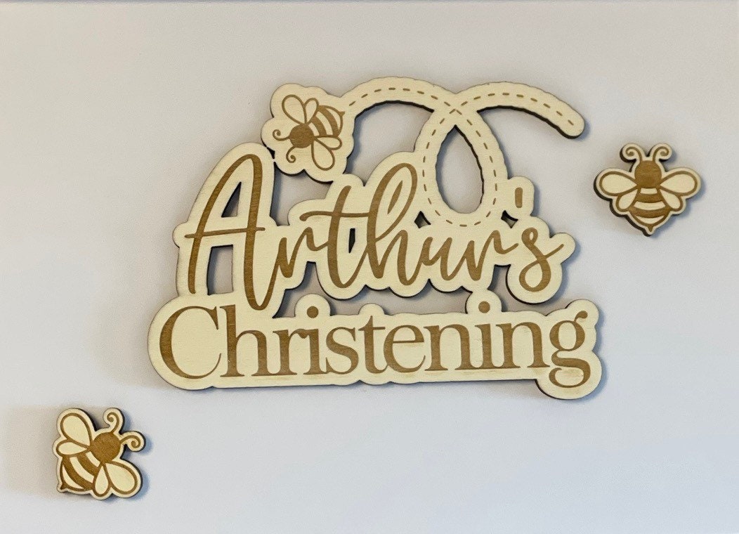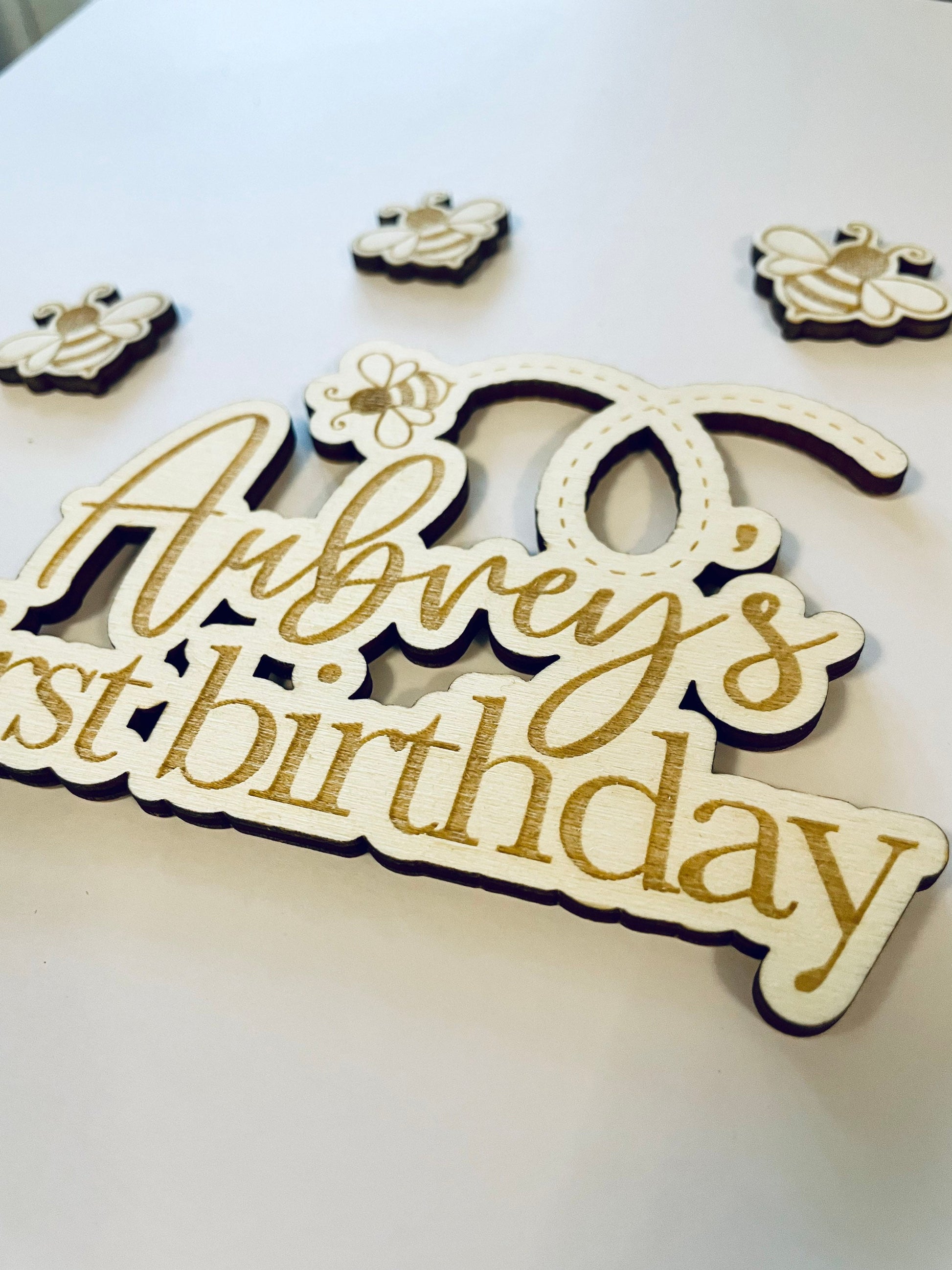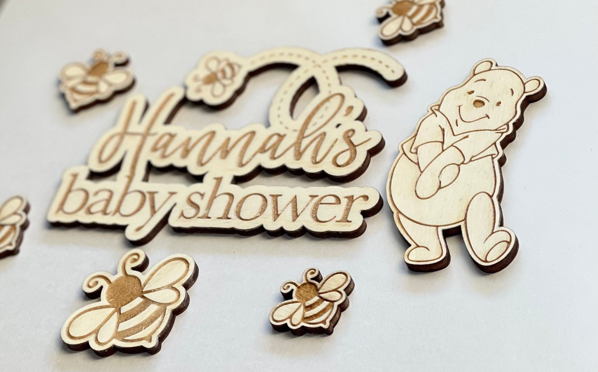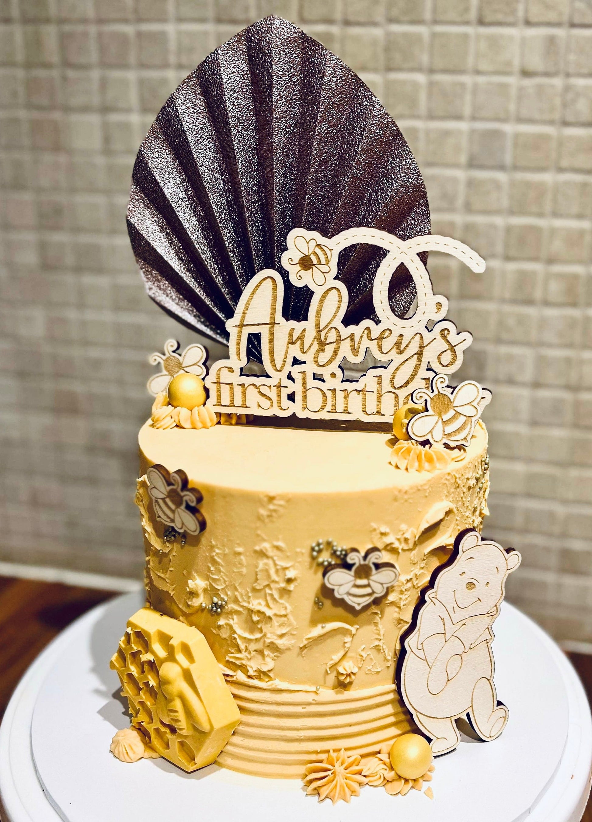 Wooden Winnie the Pooh Bear themed cake topper/charm set. Personalise with name /birthday / christening / baby shower. topper set.